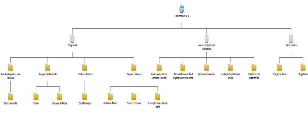 Este projeto NEV como tem uma vertente humanitária, por detrás da sua atividade, e foi uma ideia interessante da qual gostaria de fazer parte caso se venha a concretizar um dia. Para consultar o projeto mais detalhadamente, em baixo, seguem os documentos referentes à concetualização, categorização e planificação do site: